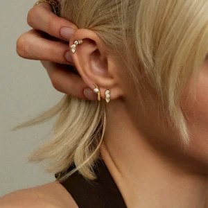 Kismet 3-Stone Mini Huggies in 18K Yellow Gold