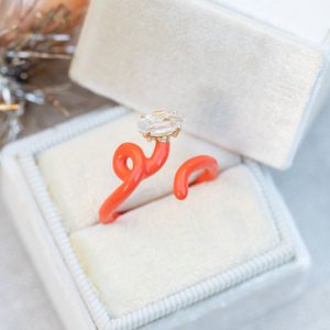Baby Vine Tendril Ring with japanese orange enamel and marquis cut rock crystal