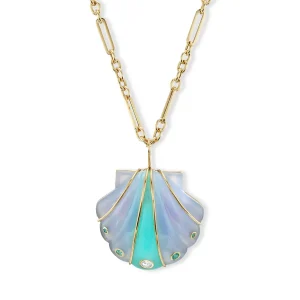 Elevate your summer style with this Large Stone Shell Pendant featuring soothing Blue Chalcedony and vibrant Chrysoprase. Inspired by coastal treasures, this statement necklace combines natural gemstones with a bold shell design — perfect for layering or wearing solo. Handcrafted and one-of-a-kind, it brings a fresh, ocean-inspired elegance to any look.