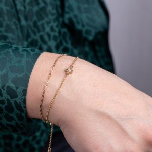 A part of The GATES Collection by M. Flynn, this modern charm bracelet comes with a gold disc surrounded by diamonds that can be engraved.