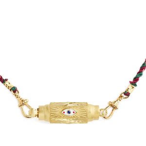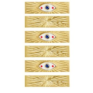Thin Barrel Pendant in Finely Chiseled Yellow Gold, with three enameled evil eyes, each containing one blue sapphire.