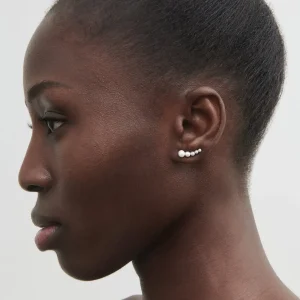 The Stellari Ear Climber by Sophie Bille Brahe features a curved gold stem with freshwater pearls on either side. This is the perfect mix of gold and pearls, great for an everyday ear filling look!