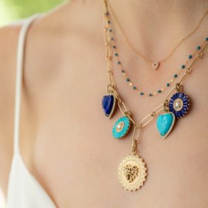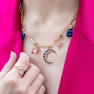 We love a celestial moment. The Estelle Crescent Moon Charm by Storrow is crafted in 14k yellow gold with shimmering diamonds and dreamy blue sapphires. It’s the perfect piece to add a little magic to your charm necklace or bracelet. Whether you’re building a meaningful charm story or just love the sparkle, Estelle brings a vintage-inspired glow to your everyday layers.