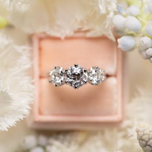 The Amelia Engagement Ring, a part of M. Flynn’s engagement ring collection, is made-to-order in 14K or Platinum. Let us help you find the perfect center stone to create the ring of your dreams. M. Flynn works with natural diamonds.