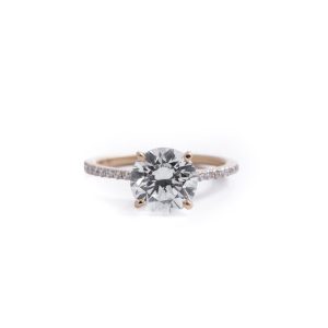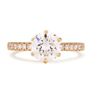 A delicate engagement ring with 6-prongs and a unique hidden halo in 14K Yellow Gold.