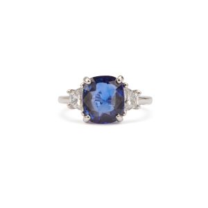 A Classy, Deco Ring with a Sapphire Center Stone with Round and Baguette Diamonds in Platinum.
