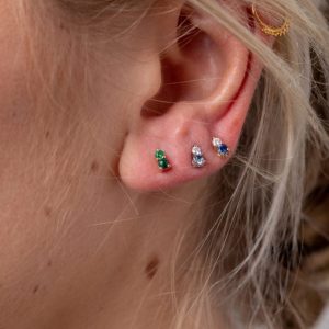 Delicate Double Stone Earrings with Montana Sapphire and Diamond in 14k Gold.