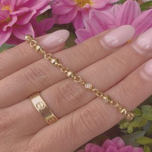 The Rolo Chain in Silver Bracelet with 14K Yellow Gold Links stands firm on its own— a simple chain with lots of playing power.