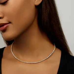 The Stella Tennis Necklace by Melissa Kaye has the sophistication and beauty of a classic diamond tennis necklace with the added luxury and sparkle of a row of eight larger sized diamonds. This tennis necklace is unique in that it is perfect to wear everyday and elevated enough for evening and ocassion-wear!