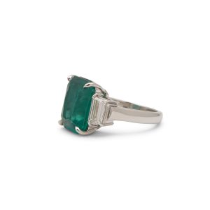 A masterpiece of timeless elegance, the Three Stone Emerald Ring is a captivating blend of classic design and modern sophistication. Set in lustrous platinum, the centerpiece is a vibrant emerald that radiates brilliance and charm. Flanking the emerald are two dazzling diamond trapezoid side stones, expertly cut to enhance the ring’s overall sparkle and symmetry. Perfect for marking life’s most special moments, this ring is a symbol of refined luxury and enduring beauty.