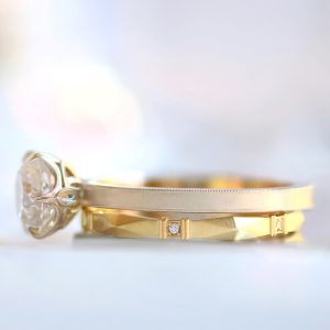 This ring is made to order – Please see below for details. Requested modifications are subject to revised production timelines and pricing. M. Flynn will work with you to select the perfect diamond or stone based on your specifications – please e-mail info@mflynnjewelry.com for more information.