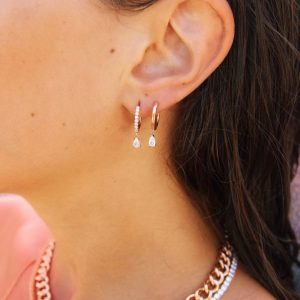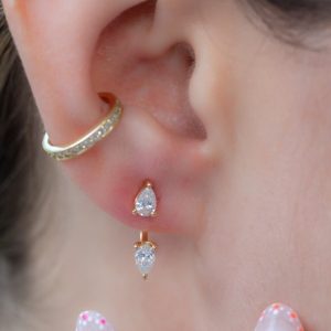 The Pear Diamond Orbit Earring by Anita Ko features pear cut diamonds that sit at the lobe and just below for an ear hugging look.