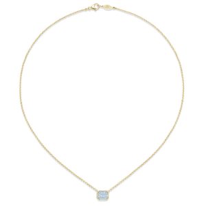 The yellow gold Diamond Sunburst Pendant by Kwiat features a mix of round and emerald cut diamonds that give the illusion of one larger emerald cut diamond. We love the bezel setting that looks classic and timeless.