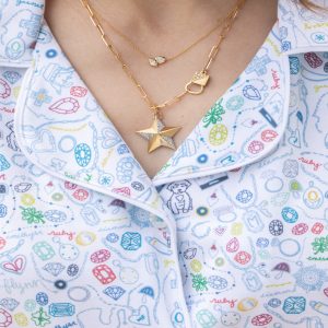 Drift off in diamonds—no jewelry box required. Our exclusive I Dream of Jewels pajama set was made in collaboration with our friends at Joy Street to celebrate sparkle in every form. Featuring hand-drawn illustrations of our favorite fine jewelry motifs (think locks, tennis bracelets, and a few iconic M. Flynn designs), this short set is perfect for sweet dreams and slow mornings. Whether you’re curled up at home or packing for a girls’ weekend, this dreamy print brings the shine—even when you’re off duty.
