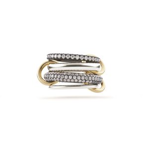 4 linked rings in sterling silver and black rhodium plated silver with micropave grey and white diamonds with yellow gold connectors.