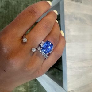 Our new Illusion Settings introduce a bigger look to a sparkly diamond. This every day eternity band features emerald cut diamonds surrounded by delicate prongs and a metal “halo” look.