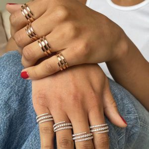 The Clara Band Was Designed To Be Worn With Other Bands Which Can Be Stacked Against Either The Flat or Crowned Edge Of The Band. This Is a Good Way To Break Up a Traditional Ring Stack By Adding New Texture and Shape. This Band Looks Especially Good Stacked With The Jade Trau Mabel Band.