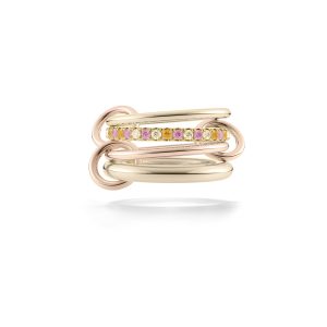 Four linked rings in 18K yellow and rose gold with U-pave champagne diamonds, light pink and orange sapphires and rose gold connectors.