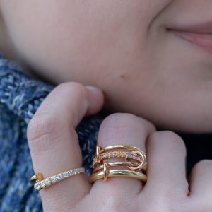 3 linked rings in 18k yellow and white gold with pave white diamonds and rose gold connectors. Size 7 is typically in stock, text us to special order and with questions at 617-292-0079.