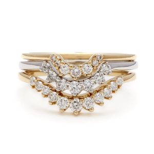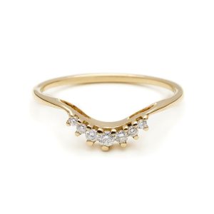 Designed to accentuate the Hazeline Solitaire and the Wheat Engagement ring, the Tiara nesting band is an exceptionally lovely piece with a cluster of five prong set white diamonds. This band can accompany an engagement singly as well as on both sides in matching or contrasting metal colors and a variety of gemstones.