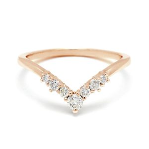 Designed to accentuate the Hazeline Solitaire and the Wheat Engagement ring, the Tiara nesting band is an exceptionally lovely piece with a cluster of five prong set white diamonds. This band can accompany an engagement singly as well as on both sides in matching or contrasting metal colors and a variety of gemstones.