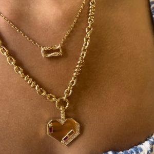 The Jumbo Heart Pendant Featuring Inaly Orange and Pink Sapphires with a Row of Round Diamonds in 18K Yellow Gold.