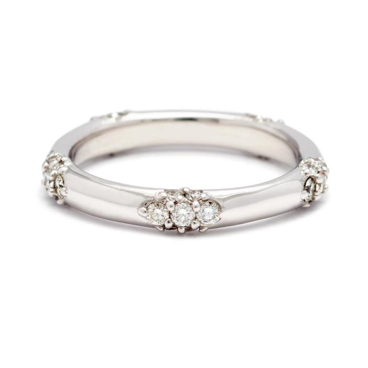 With starlit elegance, this Celestine band of solar yellow gold is adorned with five clusters of glimmering white diamonds.