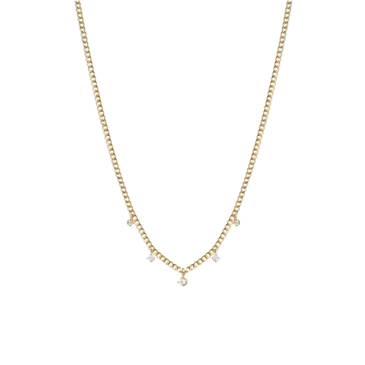 14k yellow gold extra small hollow curb chain necklace with 5 dangling prong set round diamonds in graduating sizes