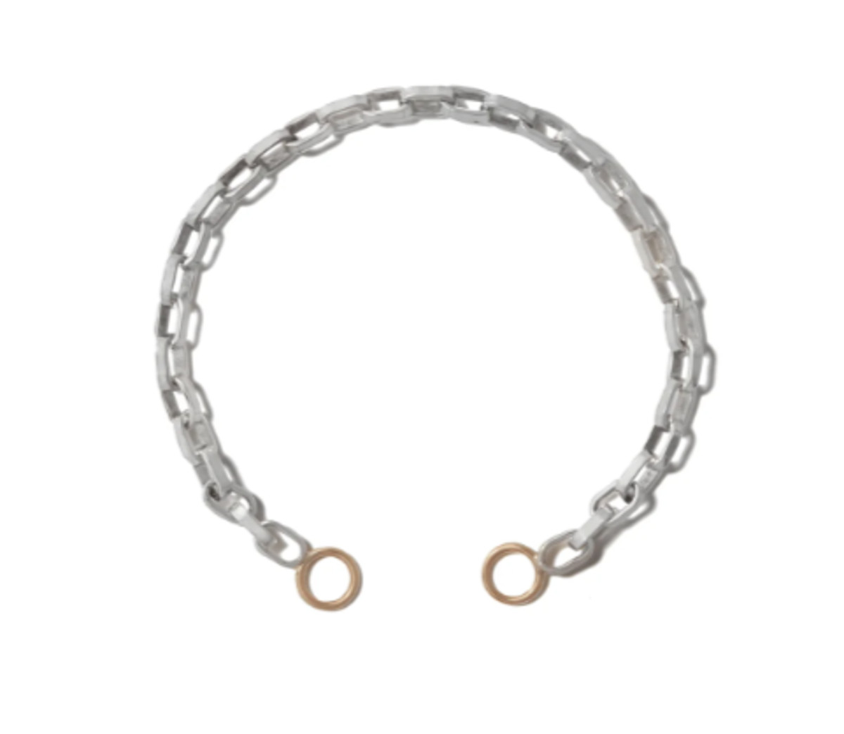 A bold statement in mixed metals. The Biker Chain Bracelet blends polished sterling silver links with subtle yellow gold loops for a modern, high-contrast look. At 6.5″, it’s designed to sit snugly on the wrist—strong, sculptural, and slightly unexpected. Wear it solo for impact or stack it to add texture to your everyday wrist game.