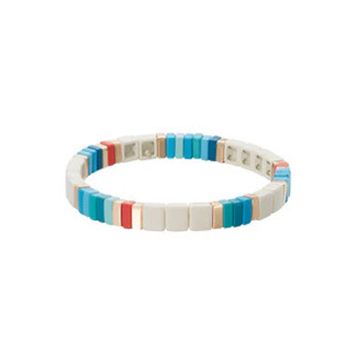 - Coastal blues, coral, cream, and gold tone stretch bracelet