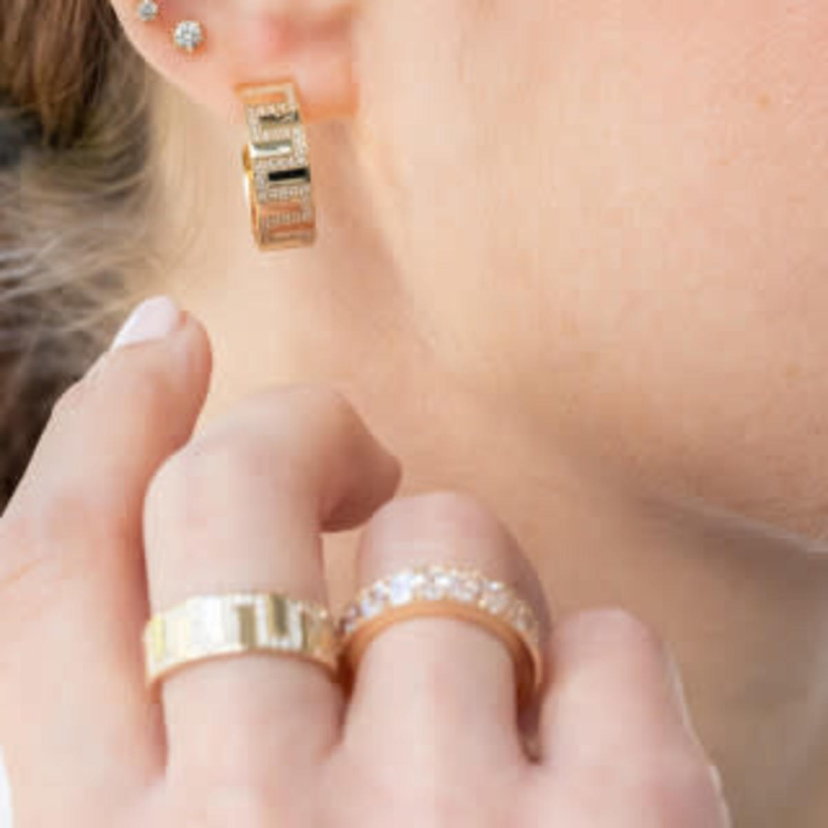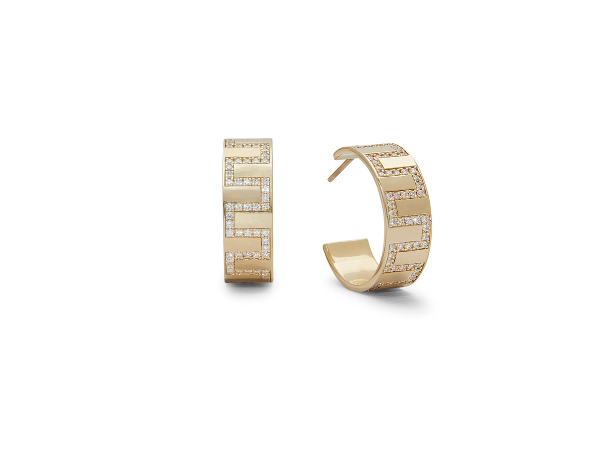 The Athena Diamond Hoops, designed in collaboration with Erin Gates, featuring a Greek Key motif of pave diamonds set in 14K gold is directly inspired by Erin’s interior designs.