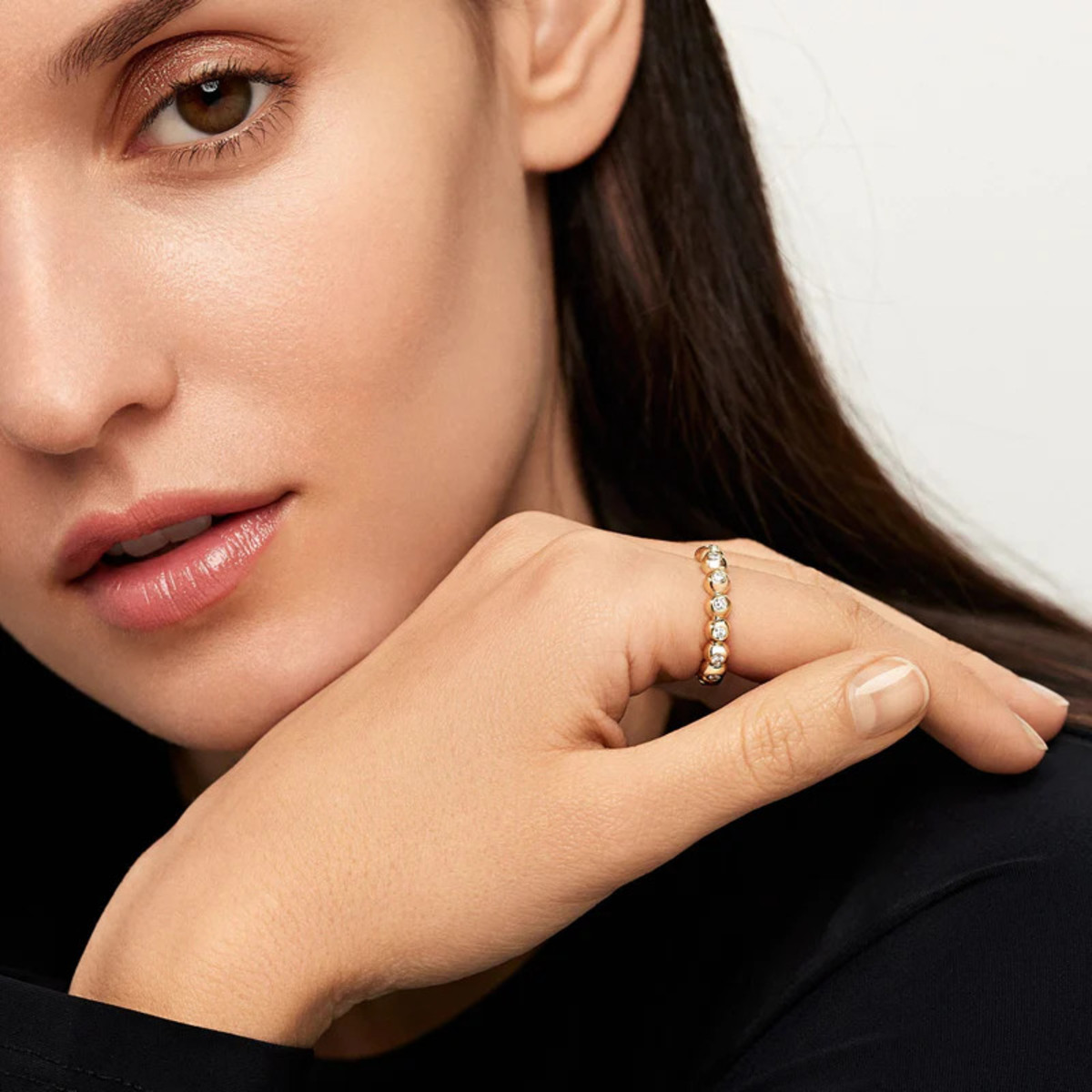The Audrey Diamond Eternity Band by Melissa Kaye is a unique round gold ball diamond eternity band. Stack this with a classic shared prong eternity band to balance gold and diamonds and add texture to your stack.