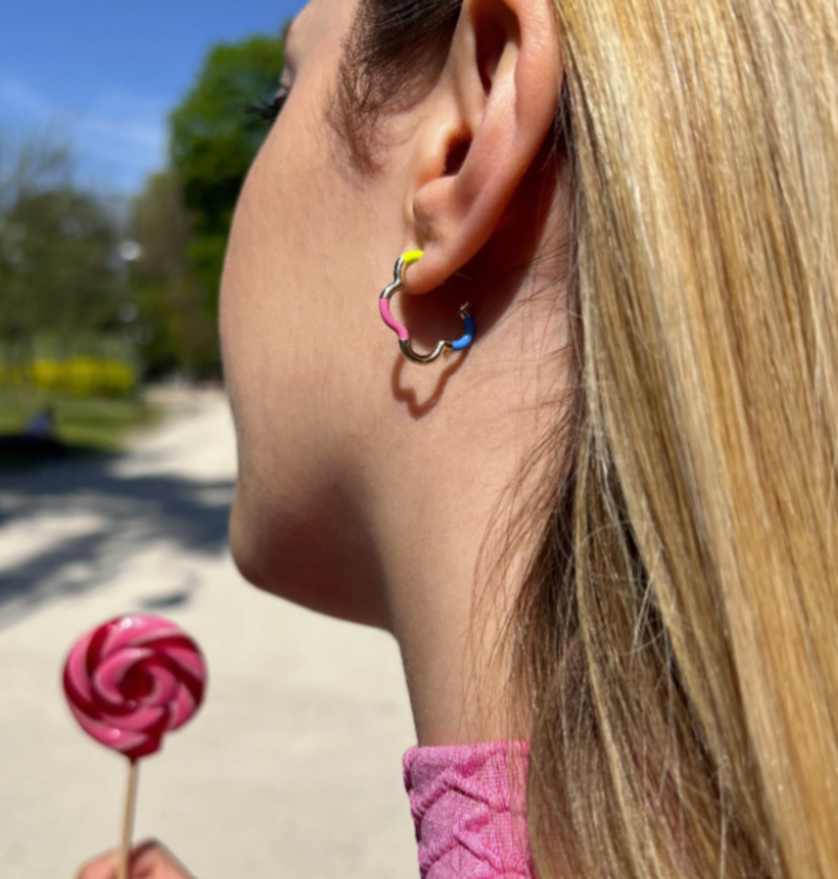 Mini Pink Green and Blue Enamel Earrings in 9K Yellow Gold
