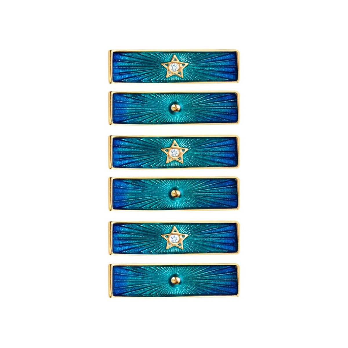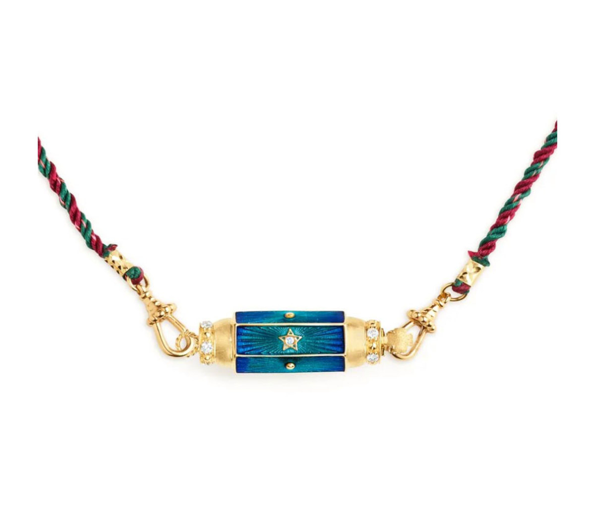 Thin Coco Look Matt Gold Pendant Barrel, Adorned with Baby Blue Enamel and Three Engraved Stars, Each Set With a Diamond. This Baby Locket Is on a 35cm Mauli Link.