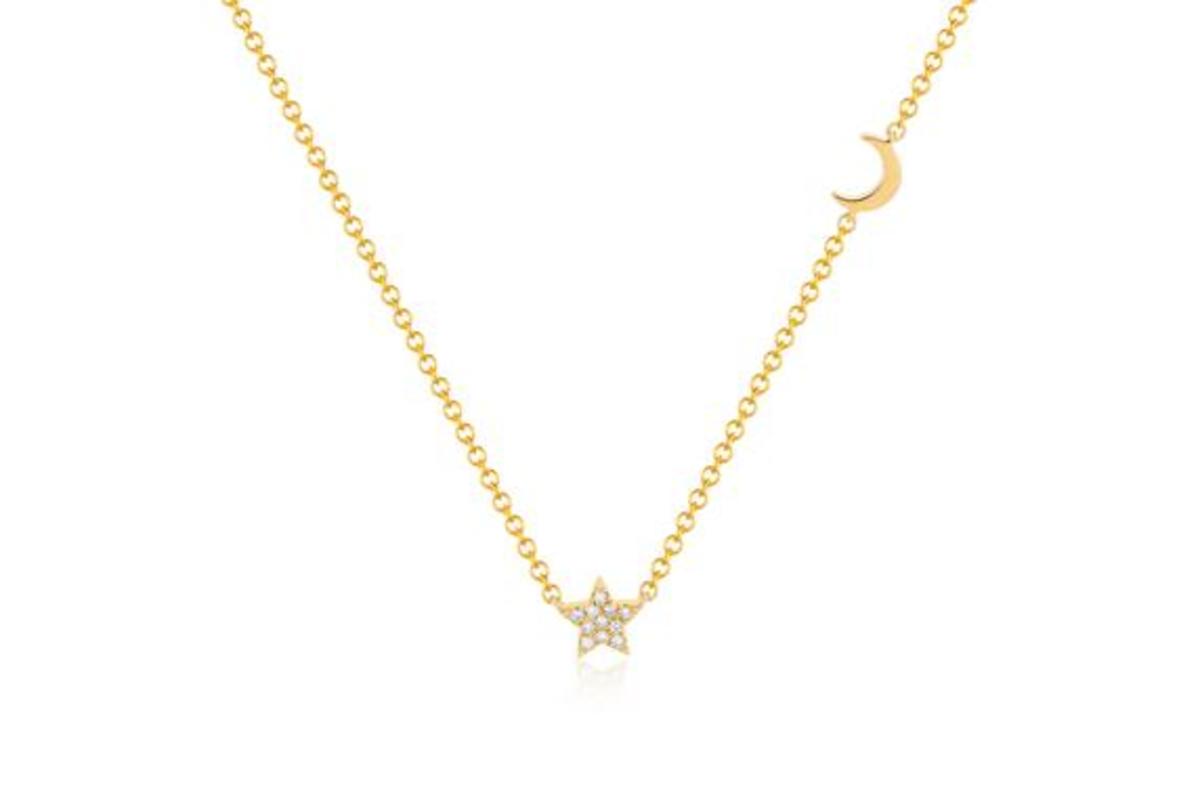 A necklace with true star power. A miniature diamond star and gold moon sit spaced along a ring-linked chain, bringing a touch of understated whimsy to your look. It features 0.02 carats of diamond set in 14k yellow gold.