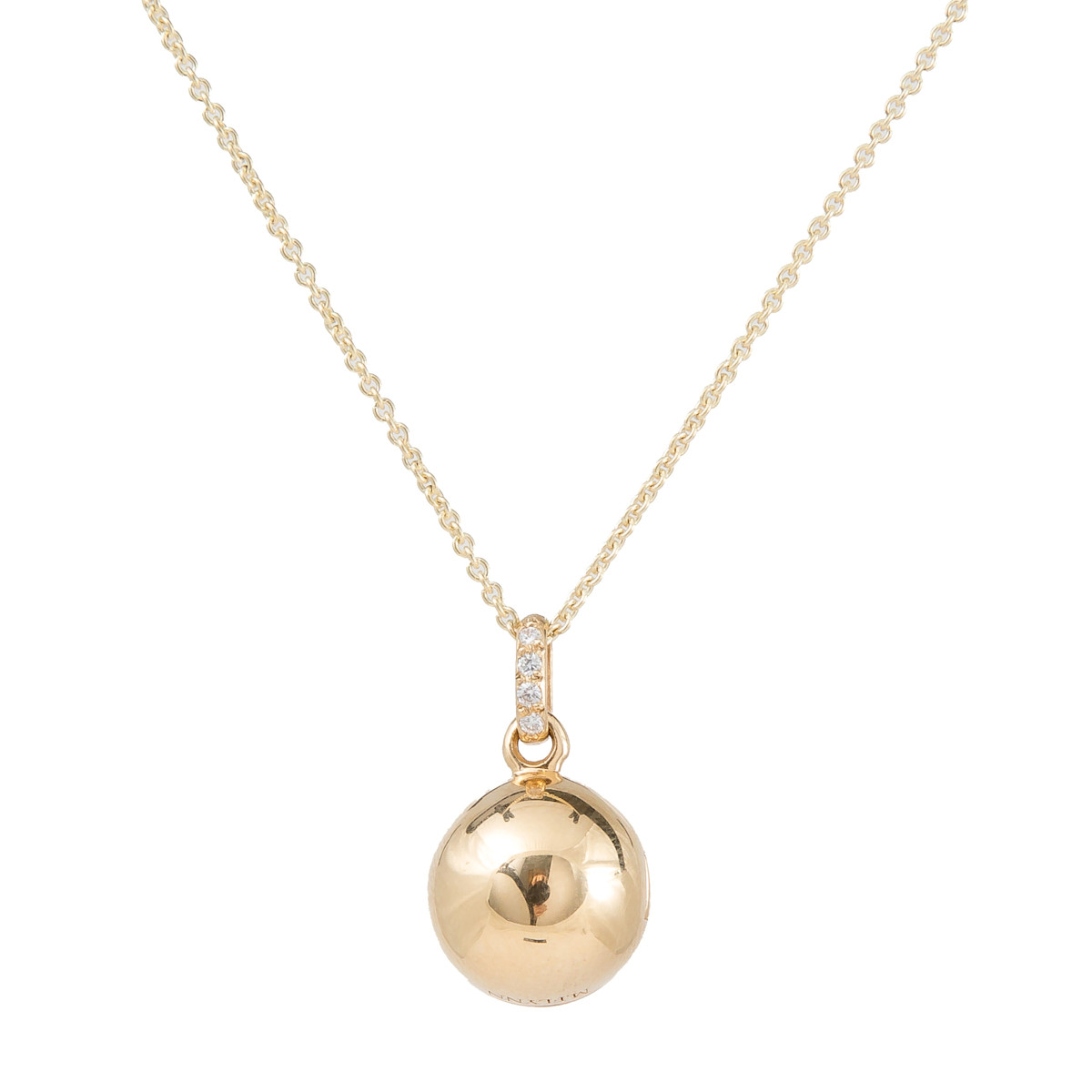 The Ball Locket features an 18k Yellow Gold ball locket with .05tcw diamond bail. Choose between a gold heart or clover charm to put inside the locket.