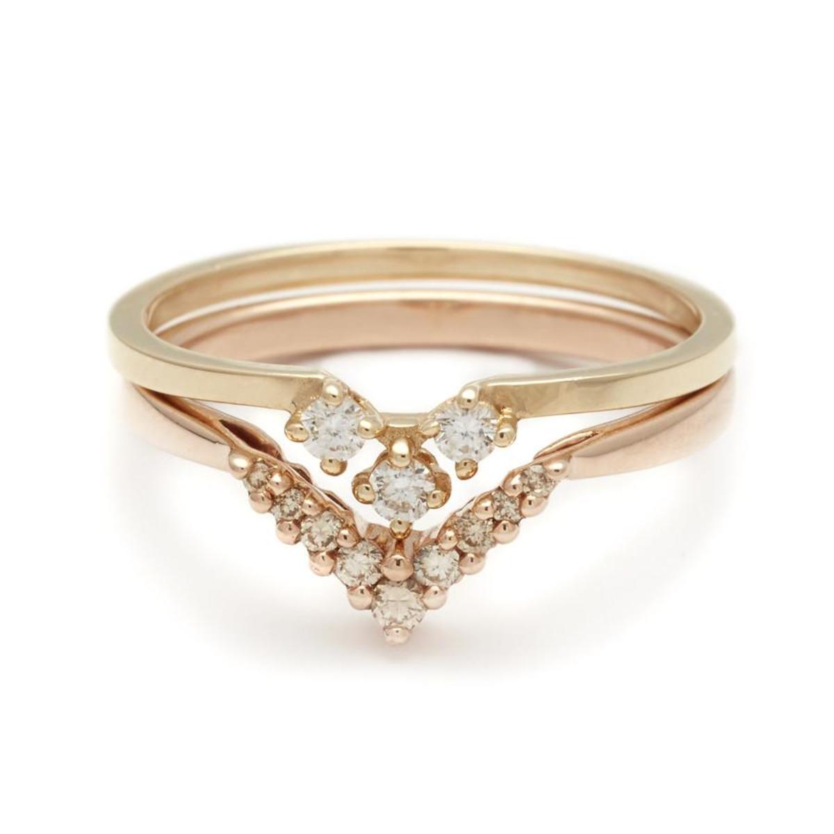 A cluster of three white diamonds at the top of a light, squared ring band complete the shape of the Bea’s signature arrow point. The notch of this perfectly petit ring makes it an elegant addition to a Solitaire or Rosette as well as in a stacking set with Anna Sheffield’s Crescent and New Moon bands.