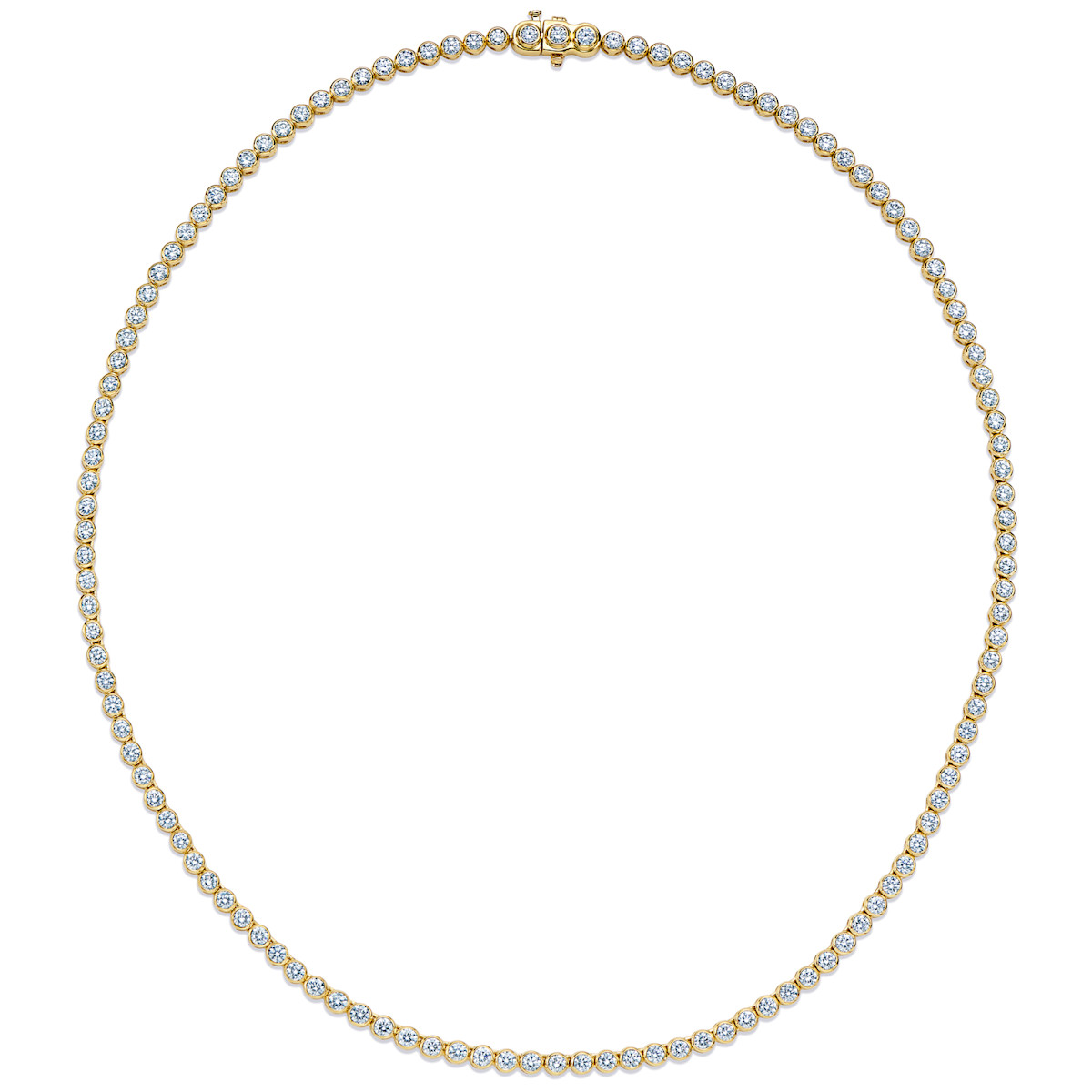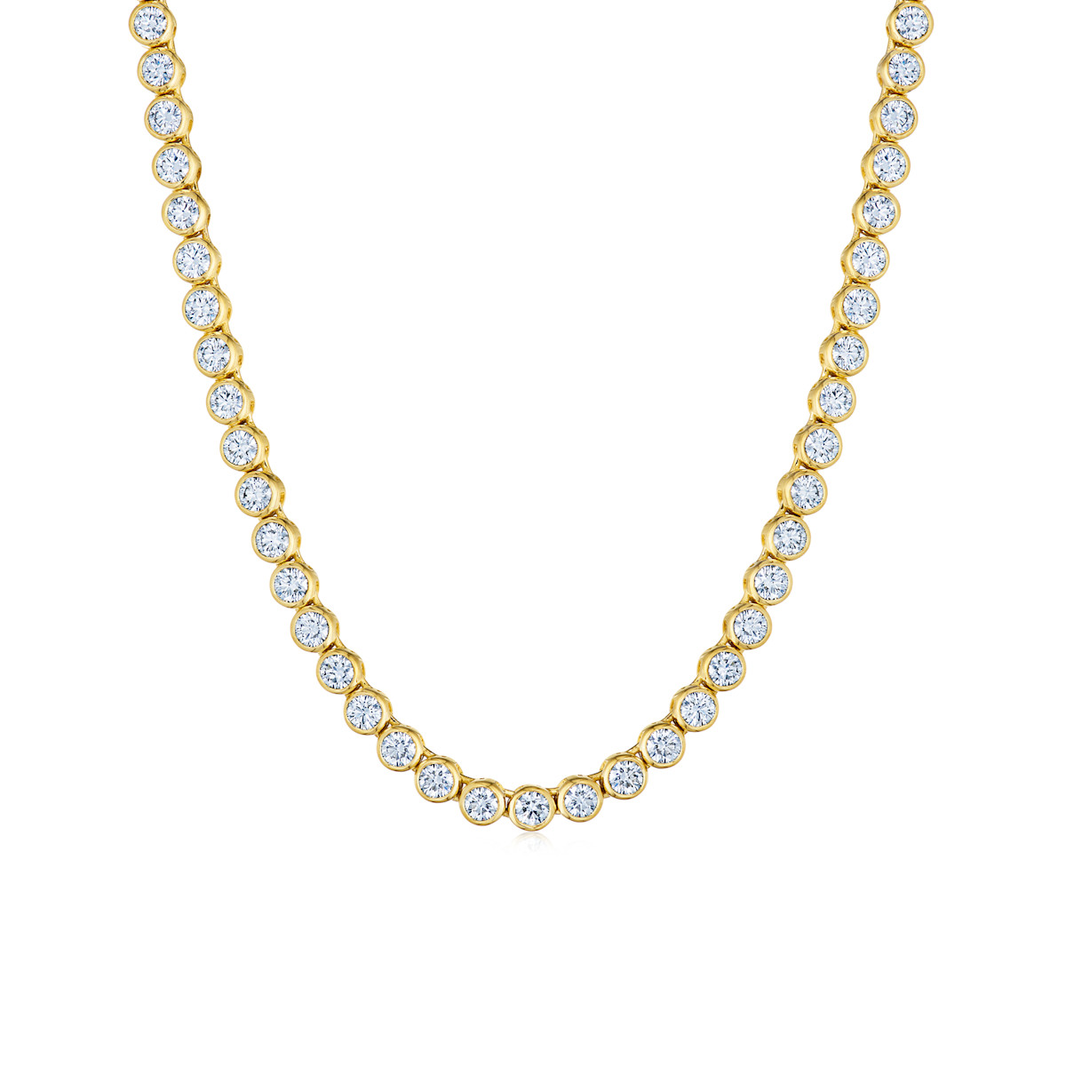 The Bezel Riviera Necklace from Kwiat is luxurious and timeless. This tennis necklace features a bezel 18k yellow gold setting surrounding each of the 124 diamonds, making it comfortable and easy to wear.