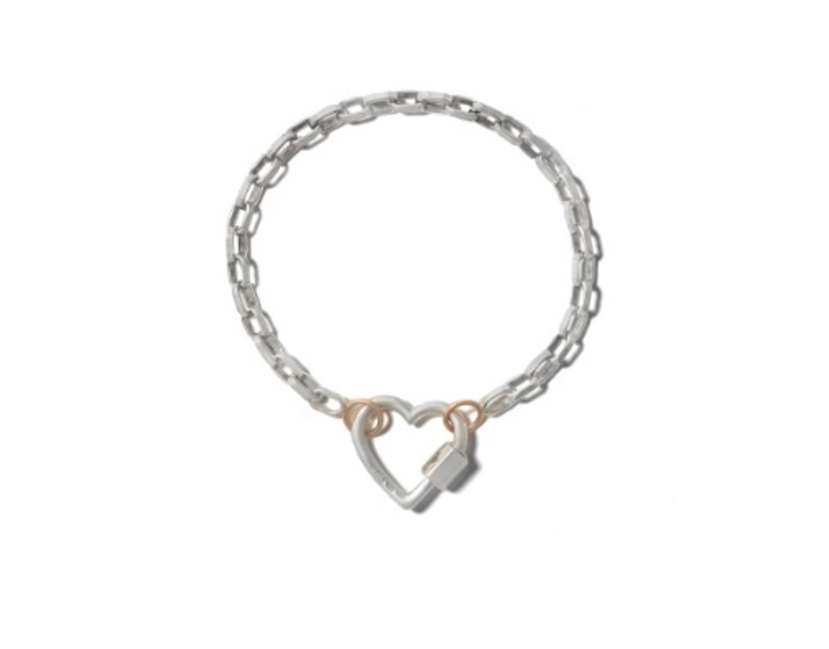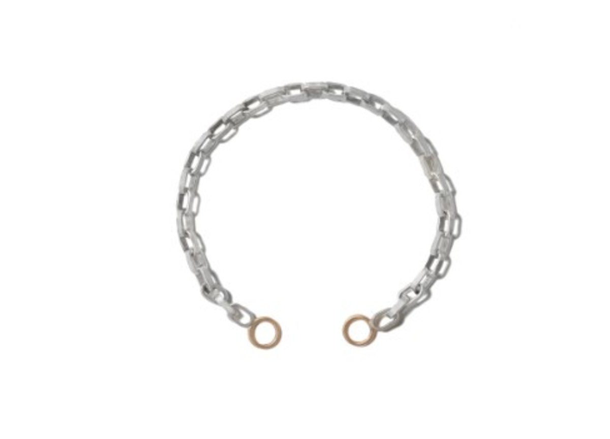 A bold statement in mixed metals. The Biker Chain Bracelet blends polished sterling silver links with subtle yellow gold loops for a modern, high-contrast look. At 6.5″, it’s designed to sit snugly on the wrist—strong, sculptural, and slightly unexpected. Wear it solo for impact or stack it to add texture to your everyday wrist game.