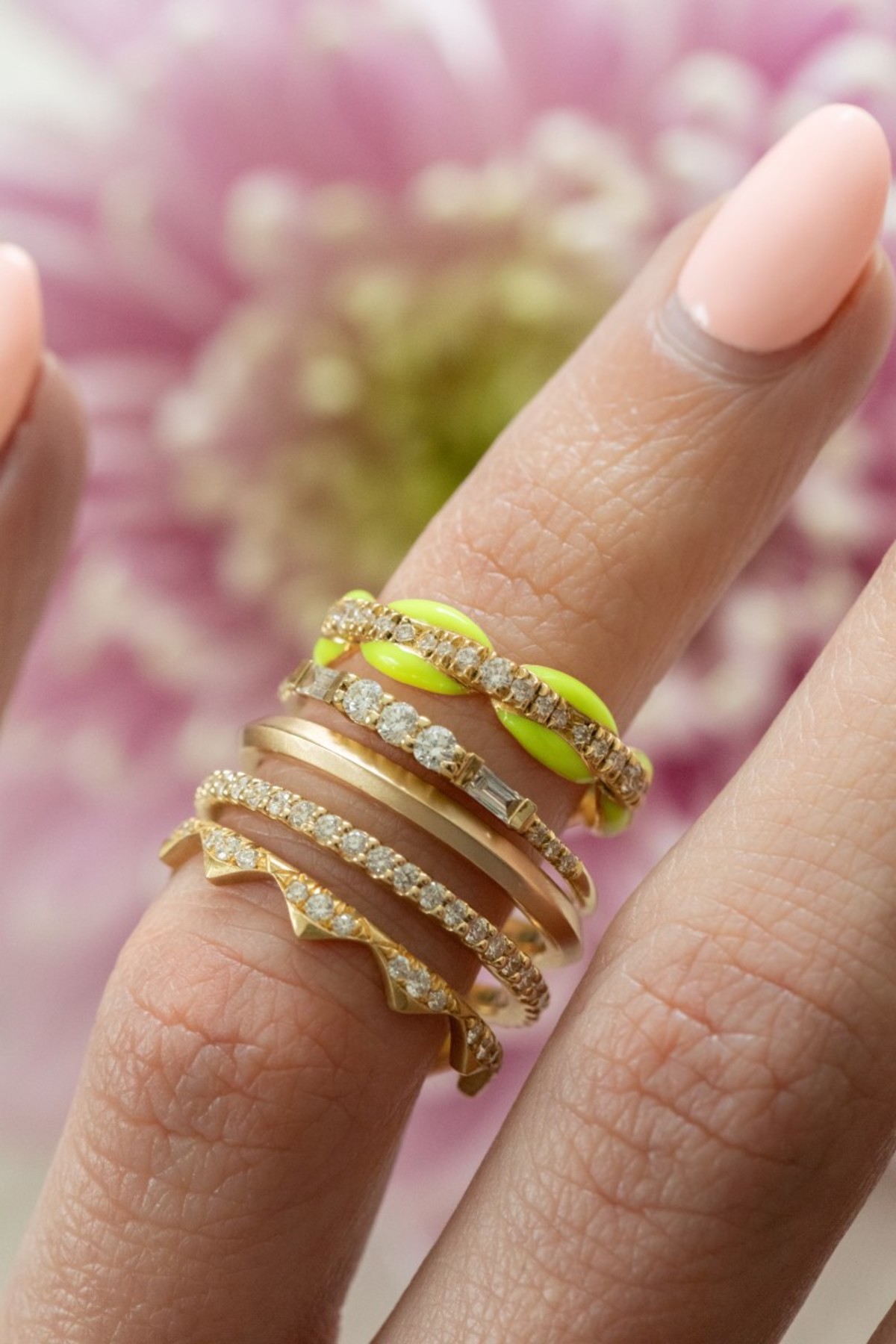 The Clara Band Was Designed To Be Worn With Other Bands Which Can Be Stacked Against Either The Flat or Crowned Edge Of The Band. This Is a Good Way To Break Up a Traditional Ring Stack By Adding New Texture and Shape. This Band Looks Especially Good Stacked With The Jade Trau Mabel Band.