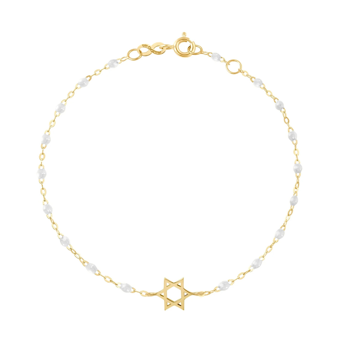This Star of David Gigi bracelet in white is handmade in the south of France and has a length of 6.7 inches, adjustable to 6.4 inches. It’s an easy fit wherever you go, worn as a single strand or layered.