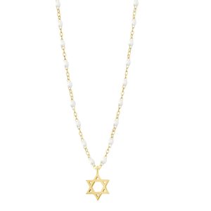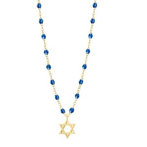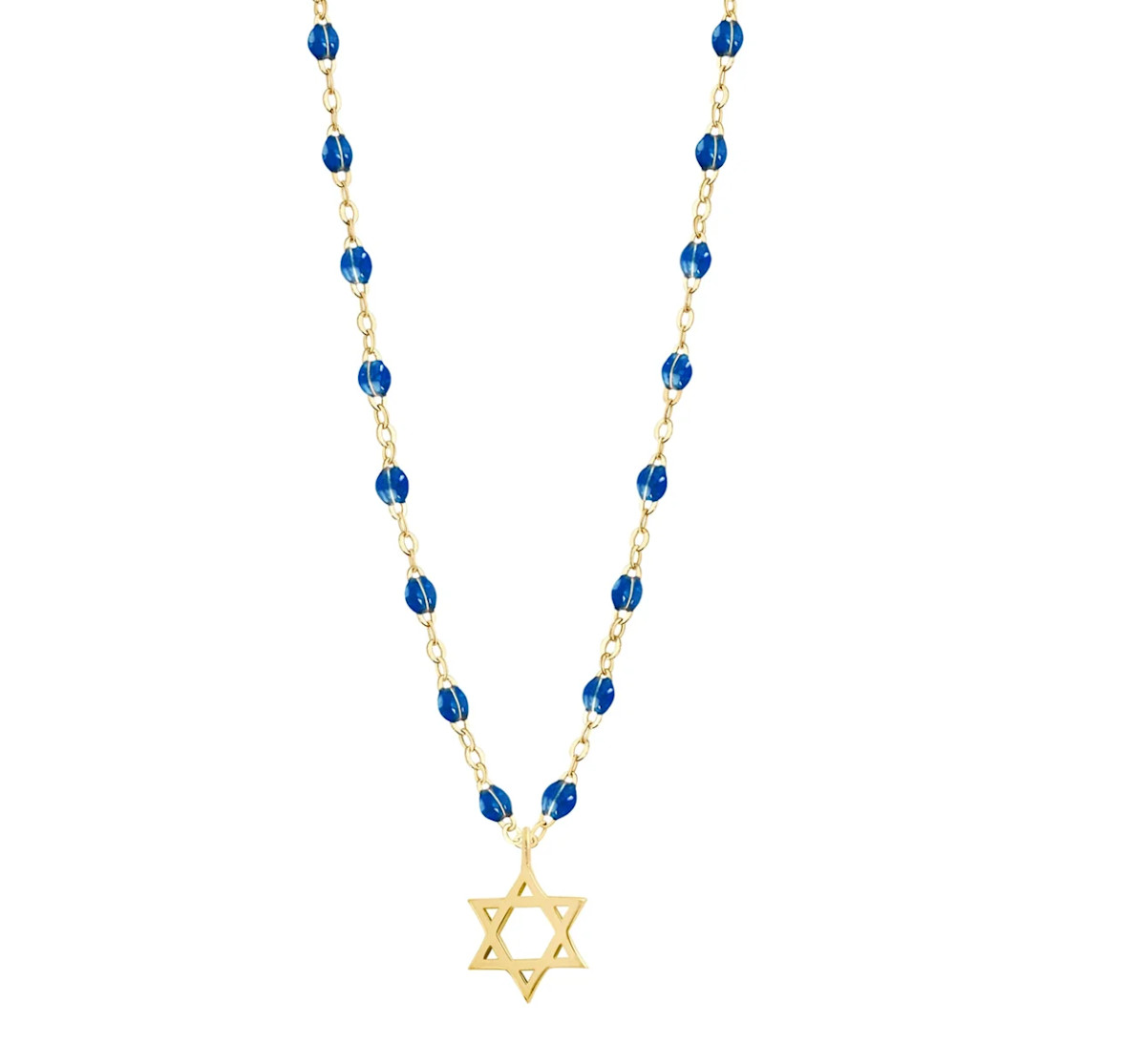 This Star of David Gigi necklace in sapphire is handmade in the south of France and has a length of 16.5 inches, adjustable to 6.1 inches. It’s an easy fit wherever you go, worn as a single strand or layered.
