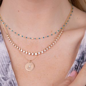 This Star of David Gigi necklace in sapphire is handmade in the south of France and has a length of 16.5 inches, adjustable to 6.1 inches. It’s an easy fit wherever you go, worn as a single strand or layered.