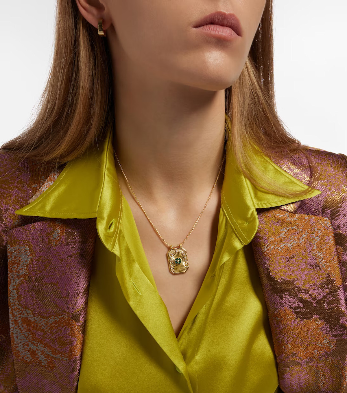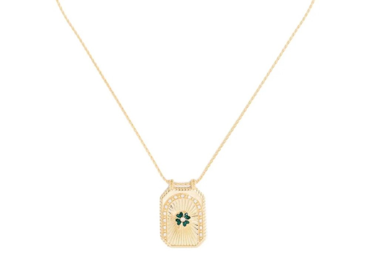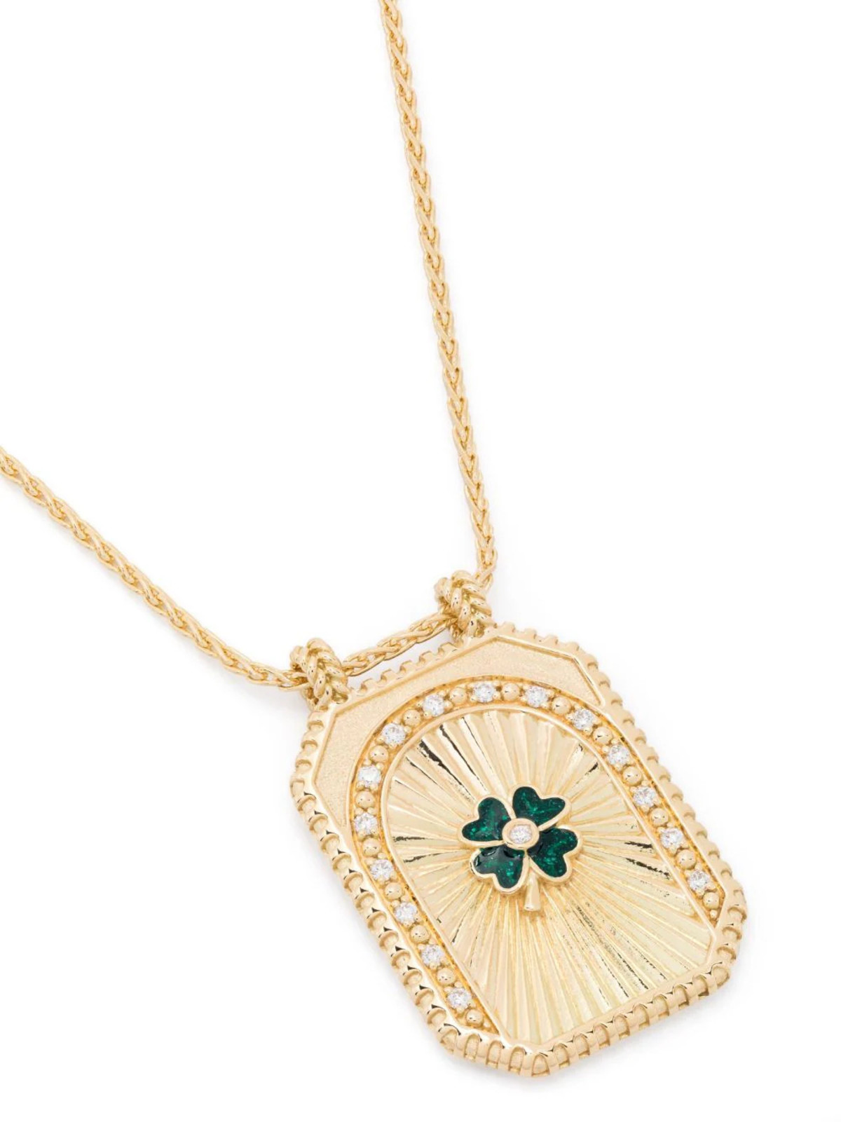 The Clover Scapular in 18K Yellow Gold by Marie Lichtenberg features a green enamel clover and an arch of diamonds above.