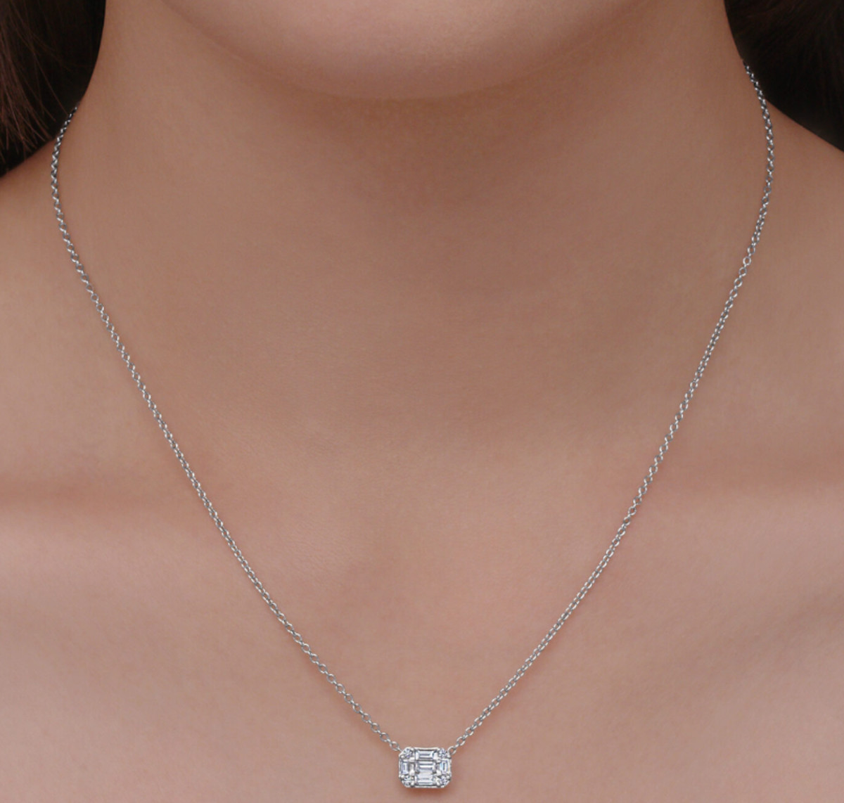 The Diamond Sunburst Pendant by Kwiat features a mix of emerald-cut and round brilliant-cut diamond offering the illusion of an emerald cut diamond. We love how the mixed-cut diamonds sparkle together and look classic in white gold.