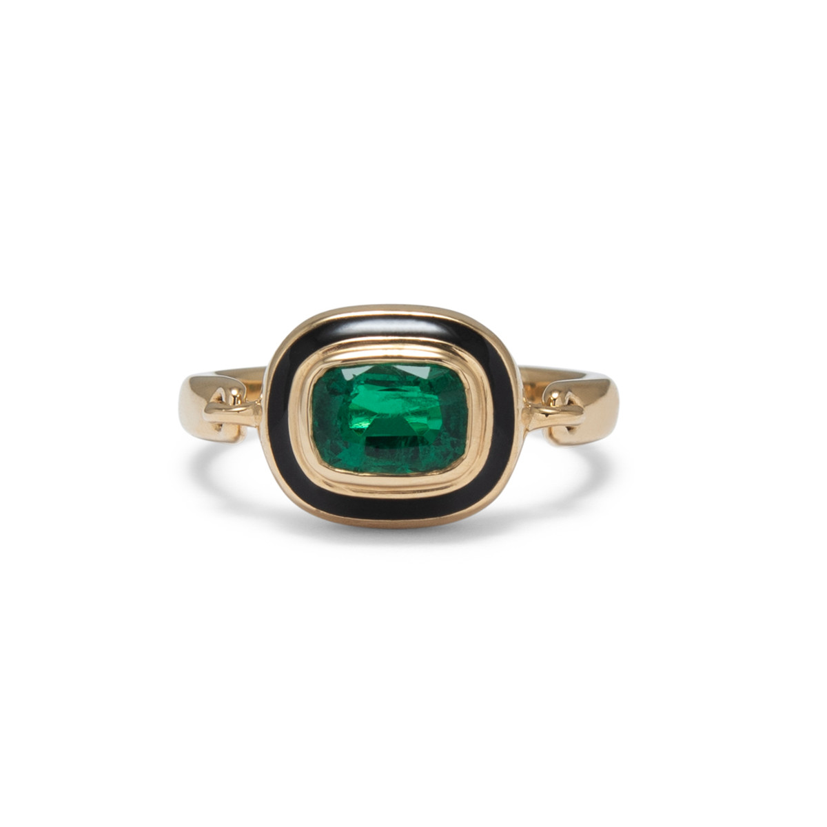 Make a (tiny but mighty) statement. This one-of-a-kind pinky ring by Melissa Kaye features a striking cushion-cut emerald framed in bold black enamel, set in rich 18k yellow gold. It’s the perfect hit of color and contrast—and an unexpected way to bring some serious bling to your pinky.