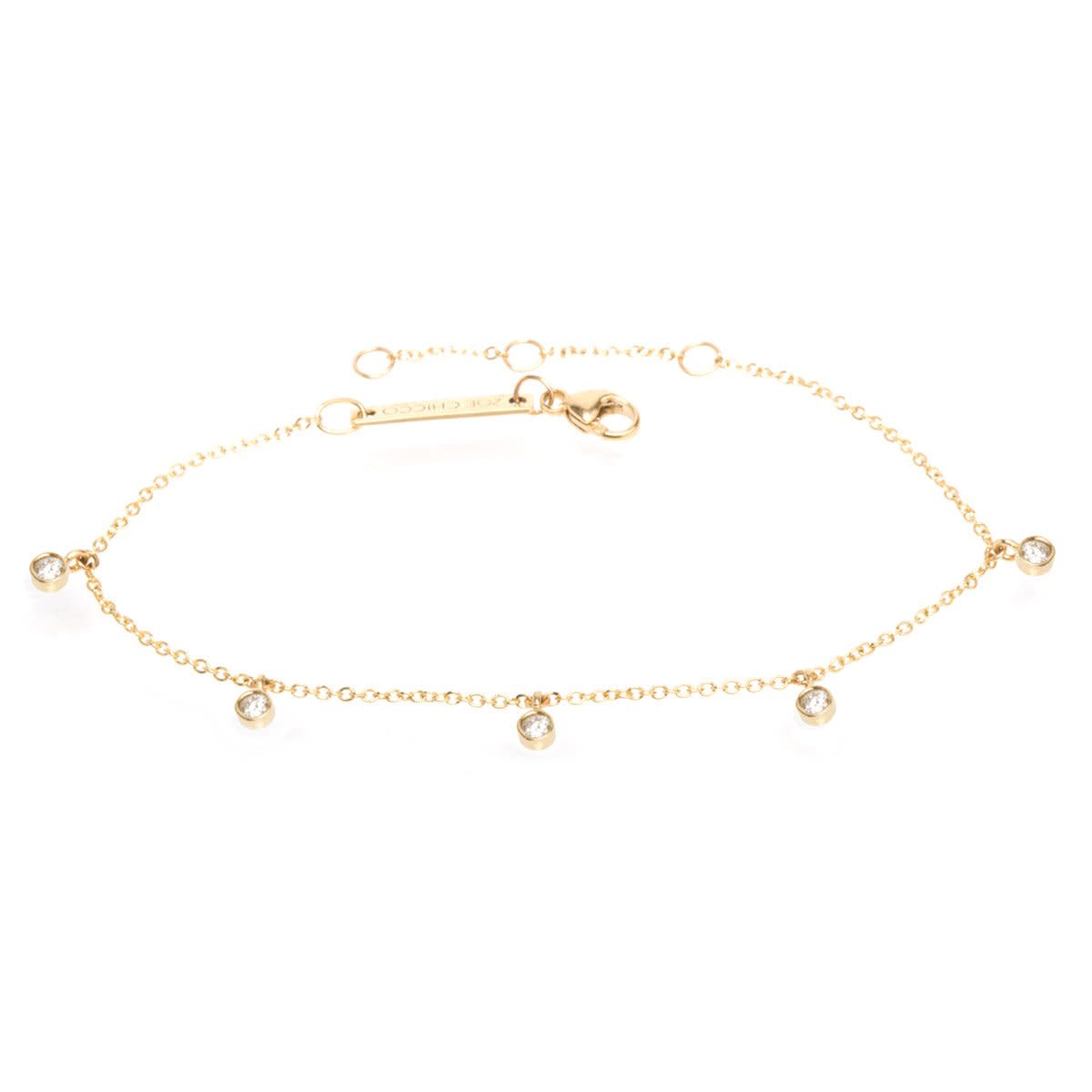 This dangling diamond bracelet by Zoe Chicco features five bezel diamonds that sparkle beautifully as they hang from an adjustable cable chain.