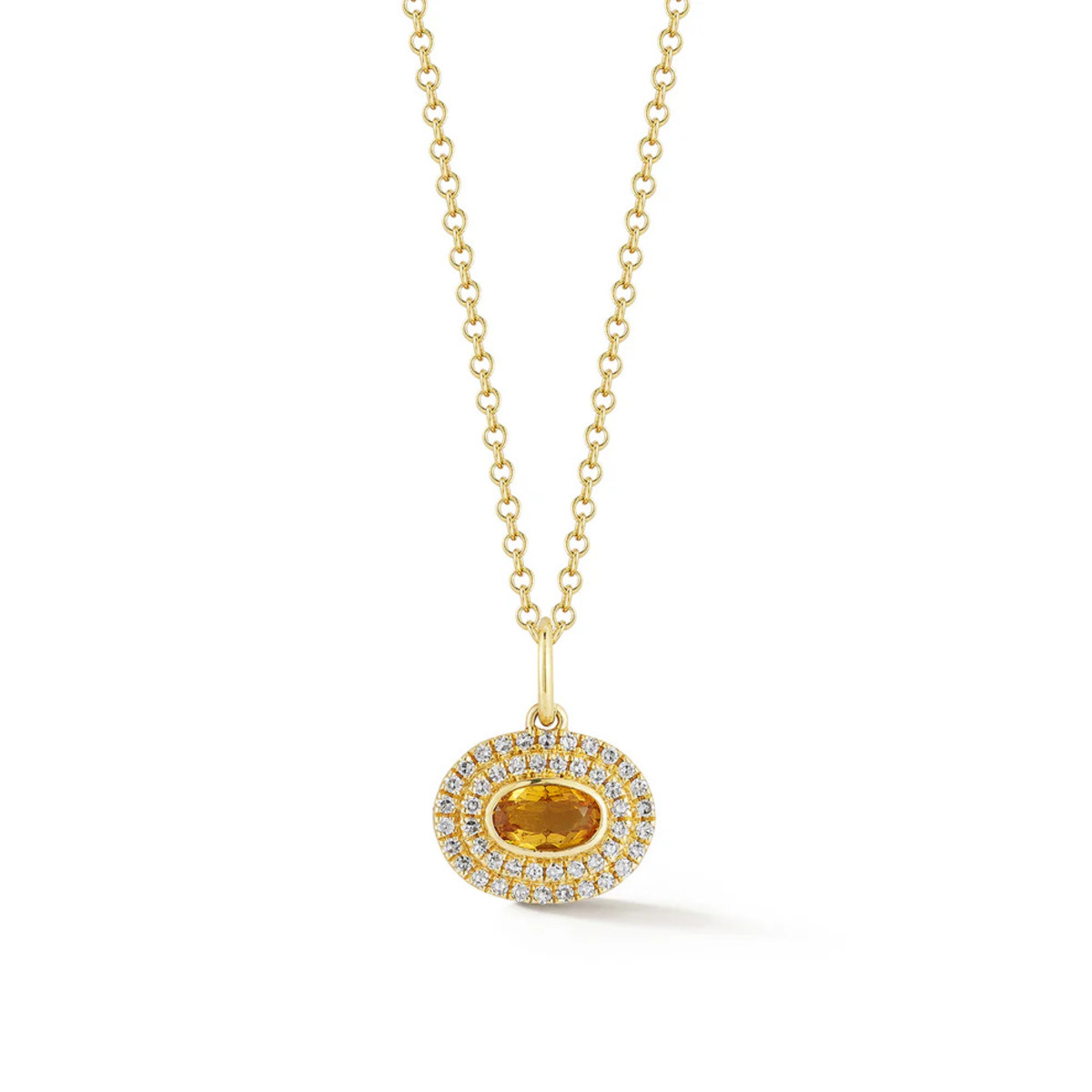 This Citrine Necklace by EF Collection is the perfect dainty gemstone pendant featuring two rows of pave diamonds surrounding a beautiful oval citrine stone. Also the November birthstone, citrine is a beautiful, neutral tone stone.