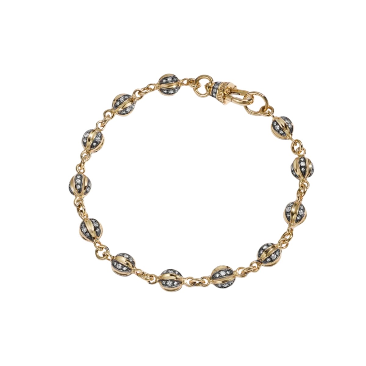 Tough meets timeless in the Diamond Ball Breaker Bracelet from M.Flynn. Featuring bold metal spheres accented with sparkling diamonds, this striking piece blends edge and elegance in perfect balance. Whether worn alone or stacked, it brings a refined rebelliousness to your everyday look. Discover standout designer pieces at M.Flynn.