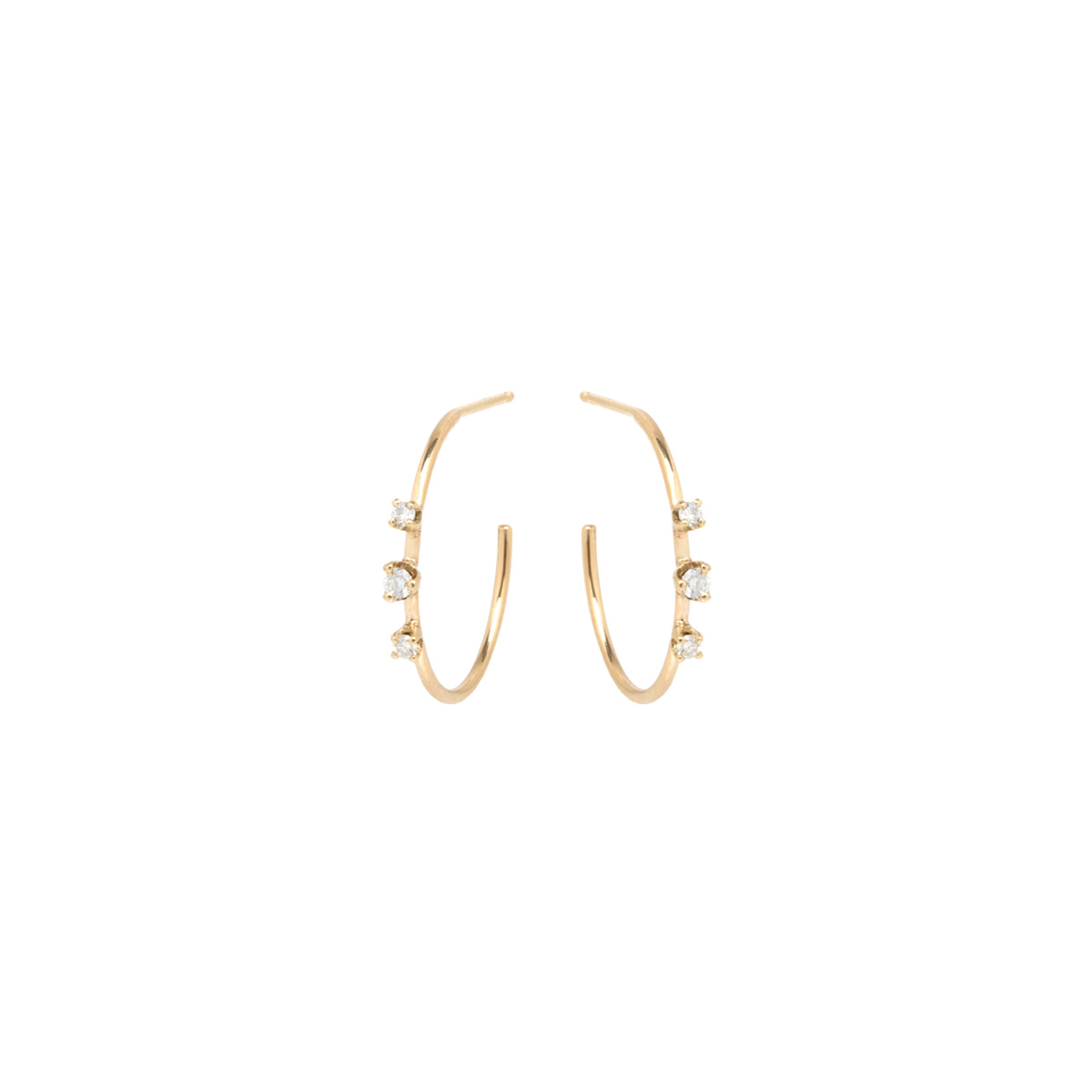 14k gold huggie hoops with 3 graduated prong set diamonds